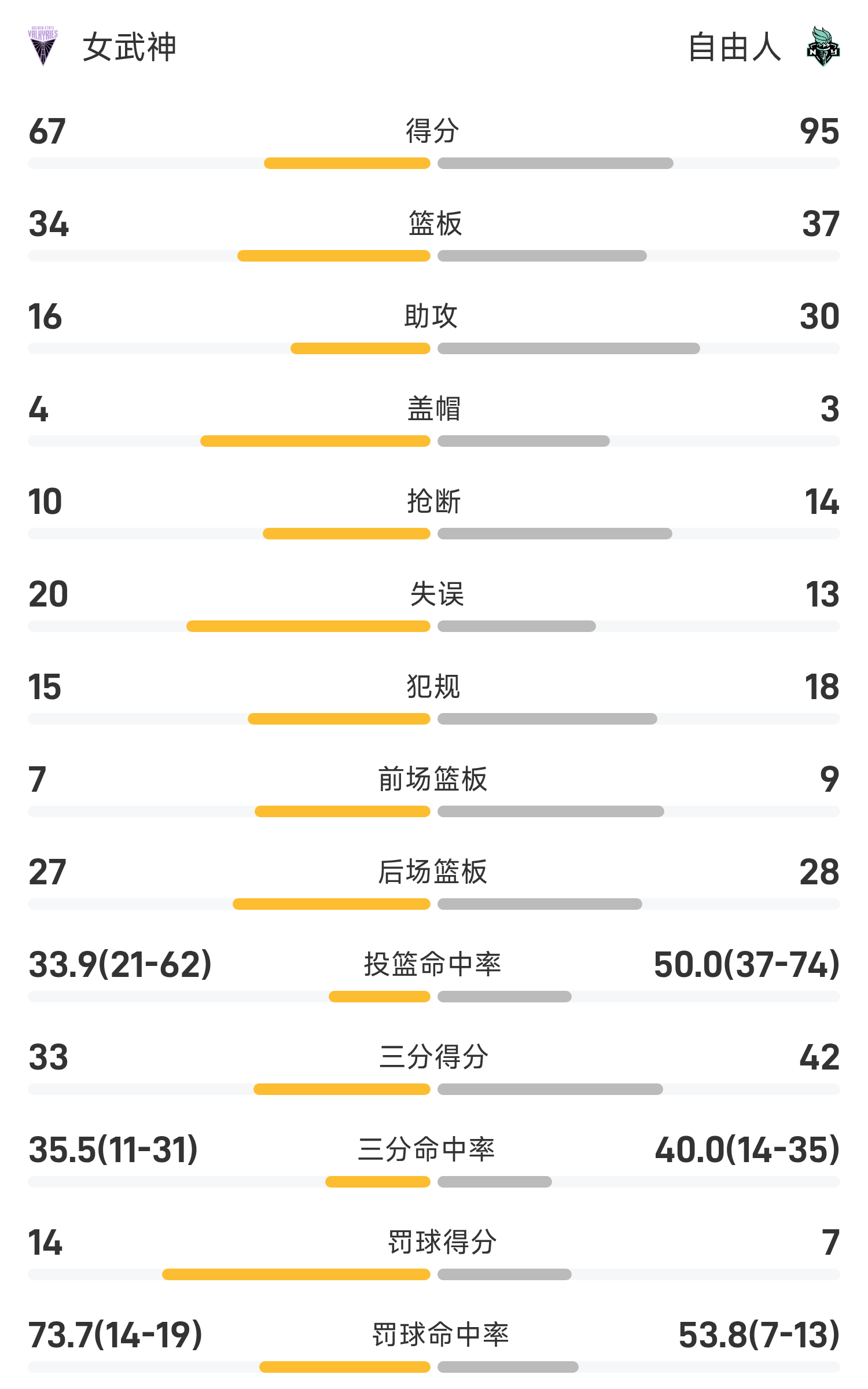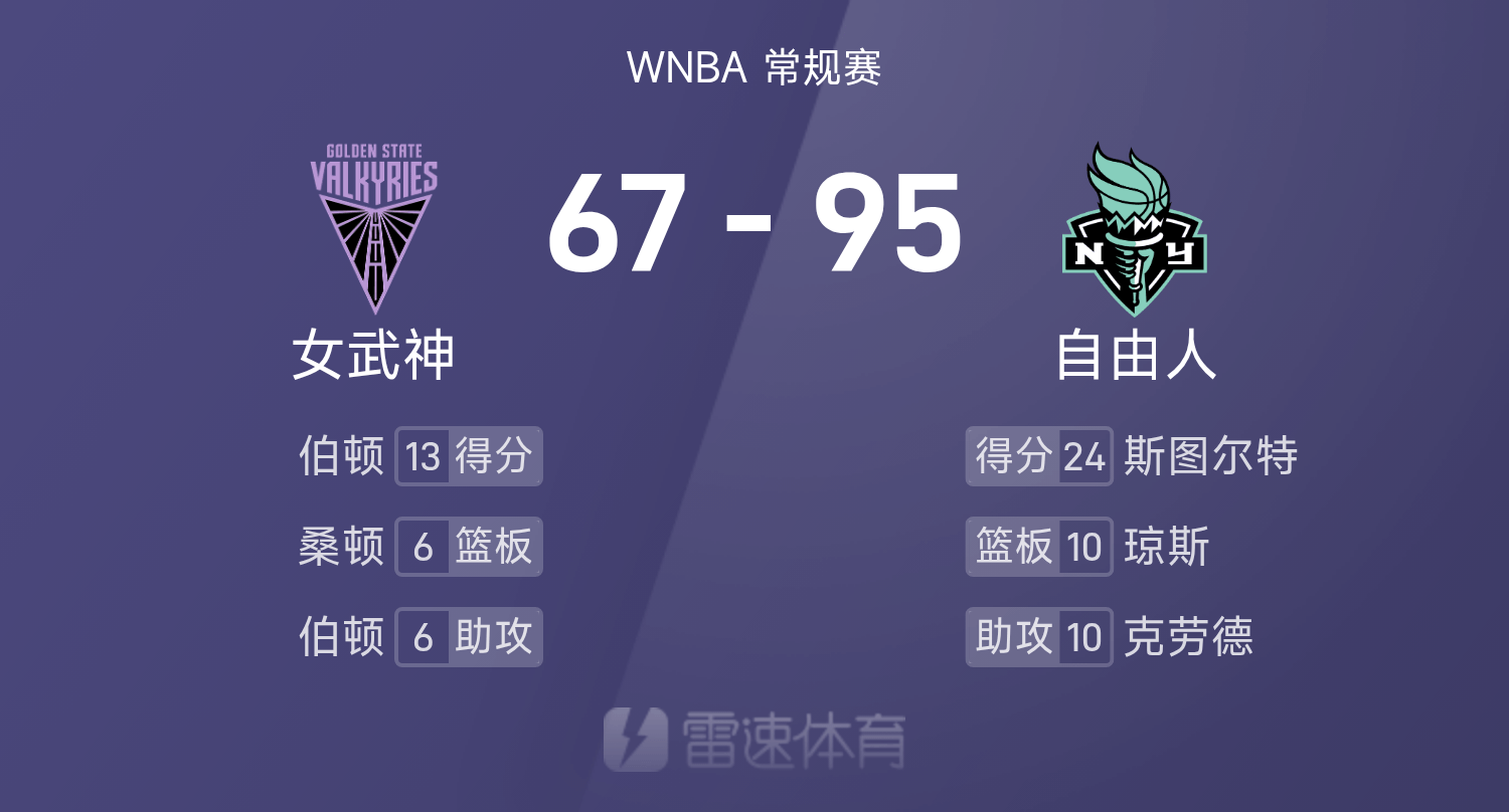 01月 15 2026 0 🏀WNBA战报:斯图尔特24分,伯顿13分6助,自由人95-67大胜女武神 xiaoqiao 2026-01-15 英超 25 05月28日讯 25赛季WNBA 常规赛,自由人对阵女武神。双方全场战罢,自由人95-67战胜女武神。斯图尔特砍下全场最高的24分1板3助,率领自由人成功取胜。球员数据 查看更多详细数据 查看更多